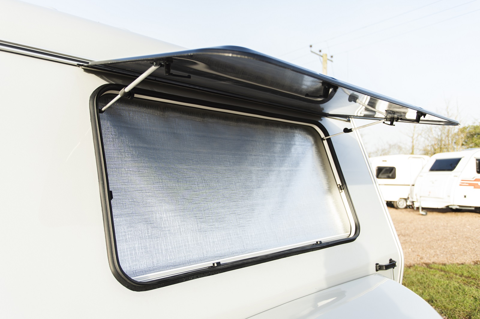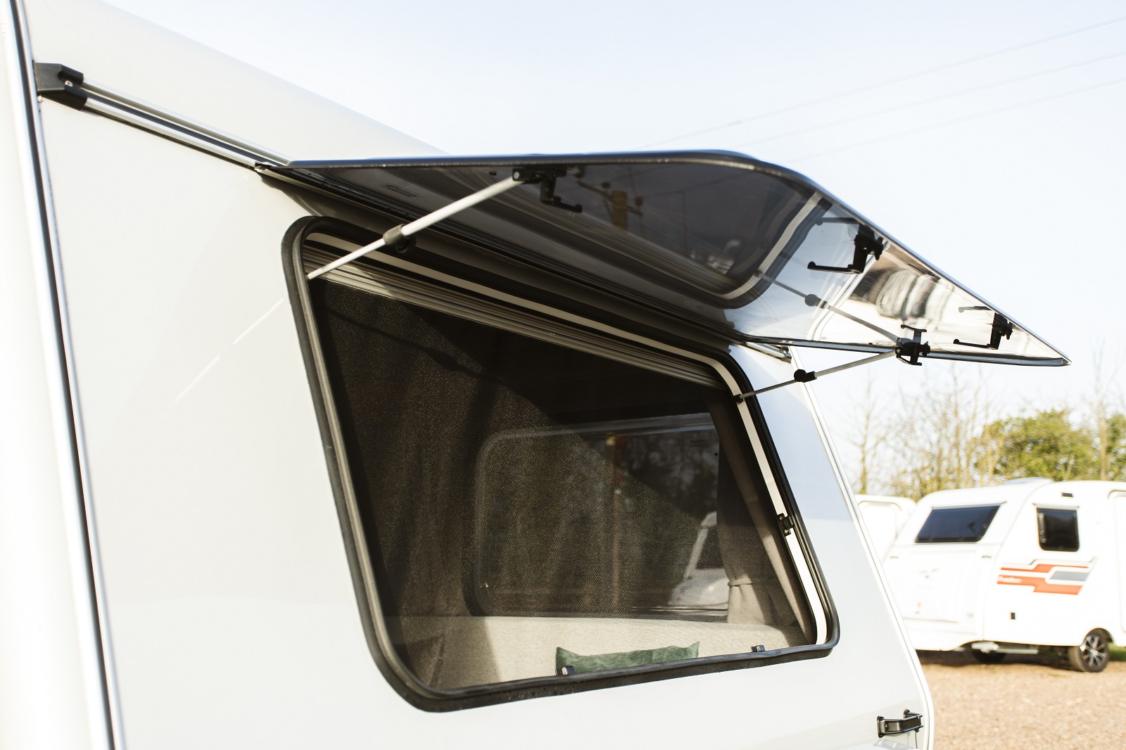 The Heki-style skylight, front and rear opening windows come equipped with easy-to-use cassette fly screens and blinds, whilst the fixed side windows have curtains