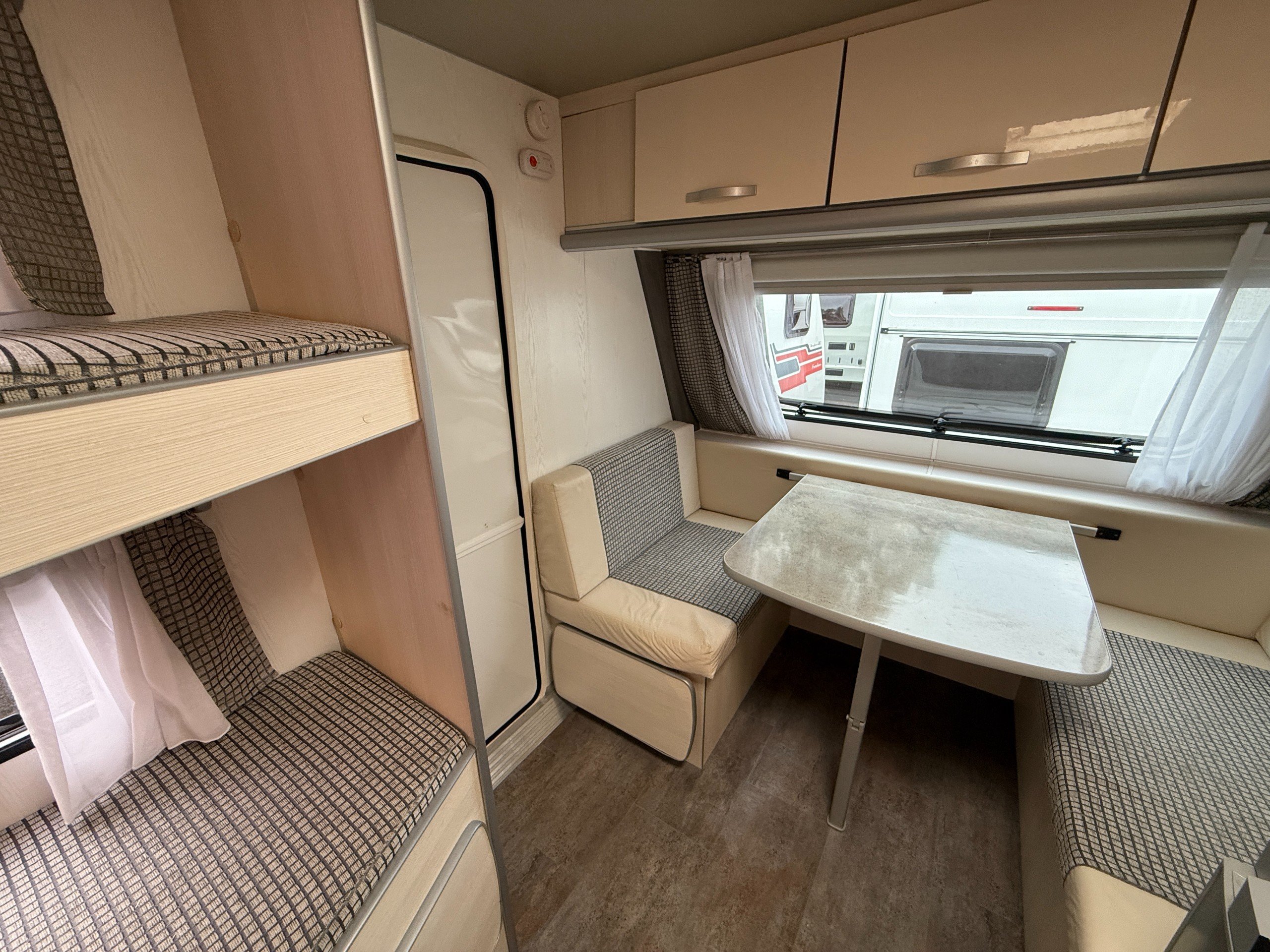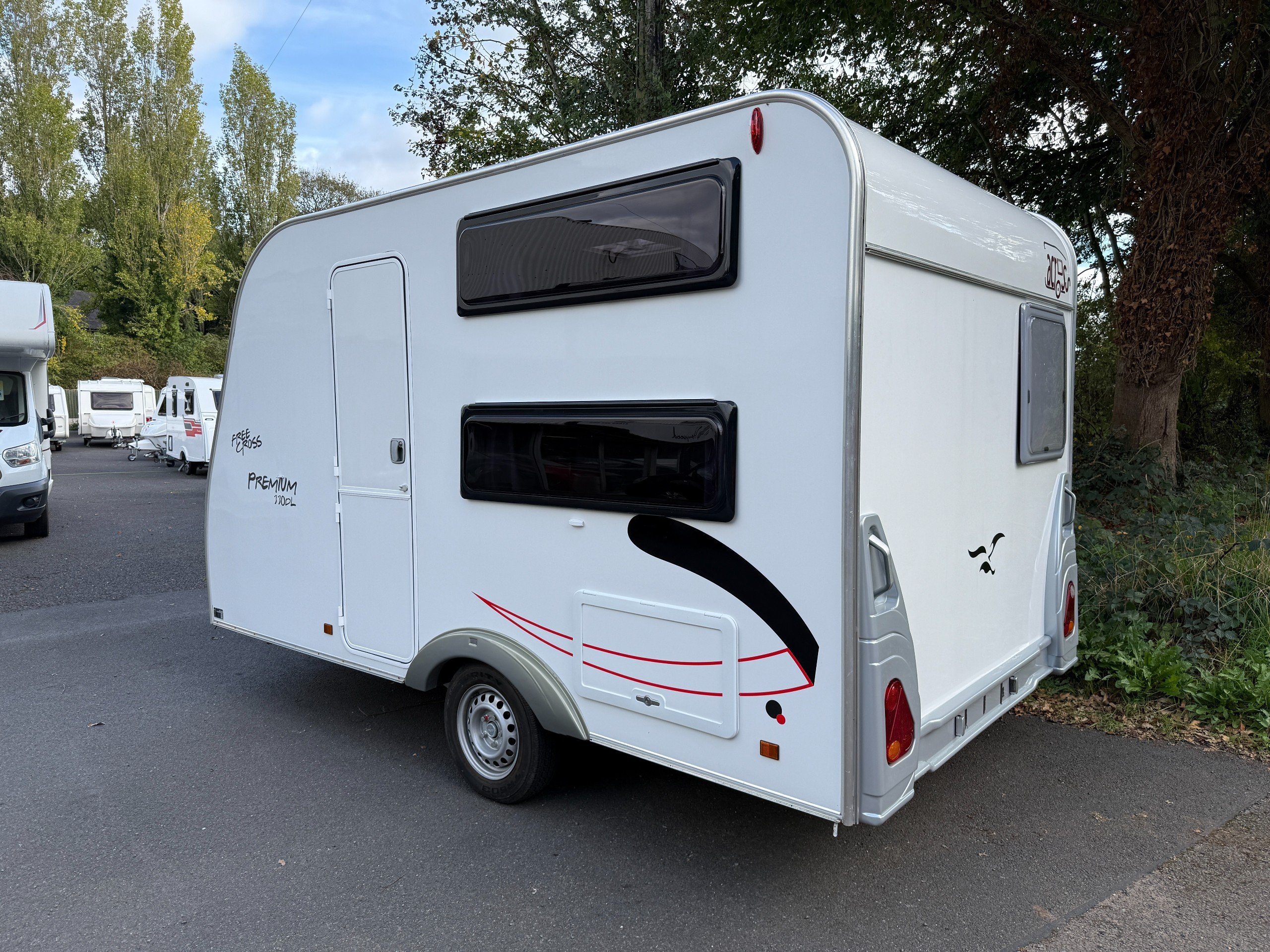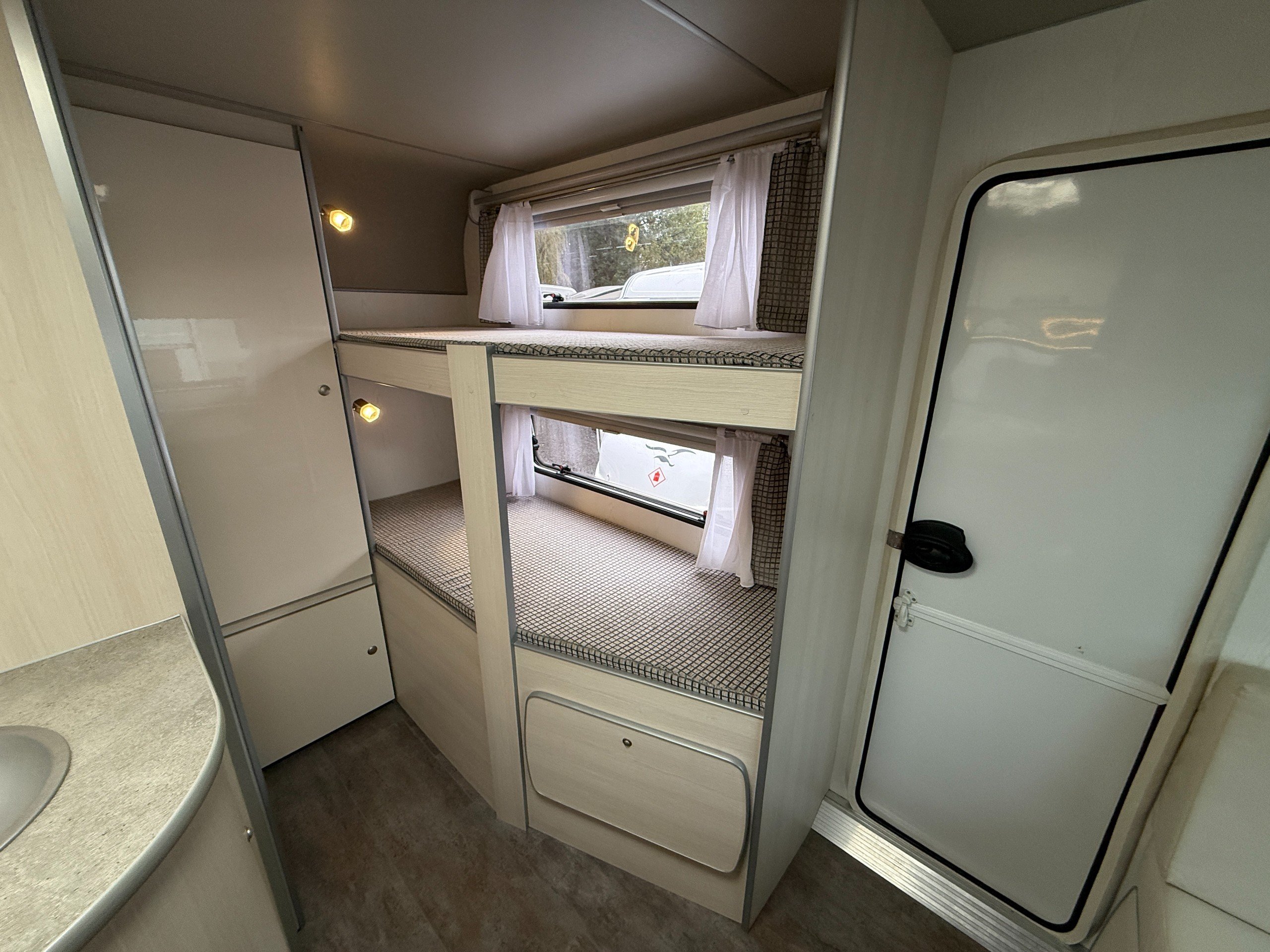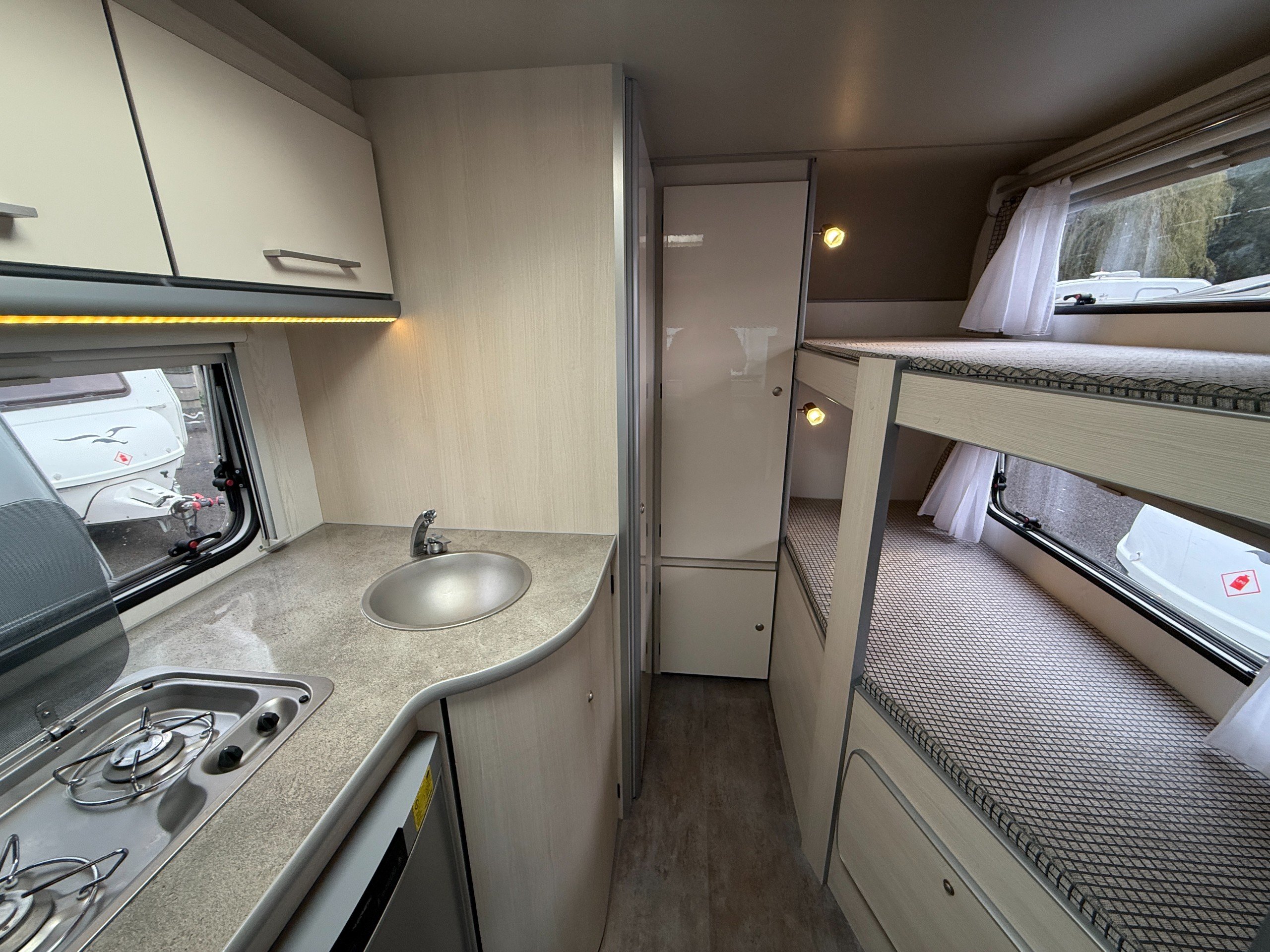 This FreeCross 330DL is a lightweight 4 berth family caravan with a double dinette conversion at the front and fixed bunk beds at the side.