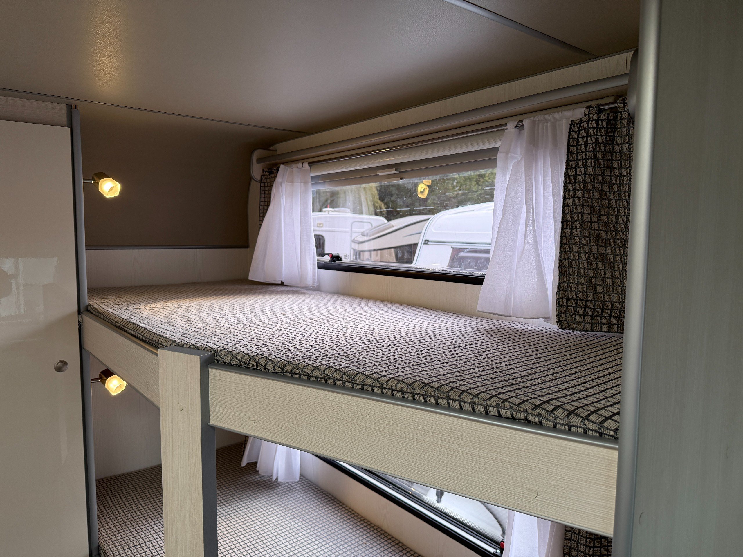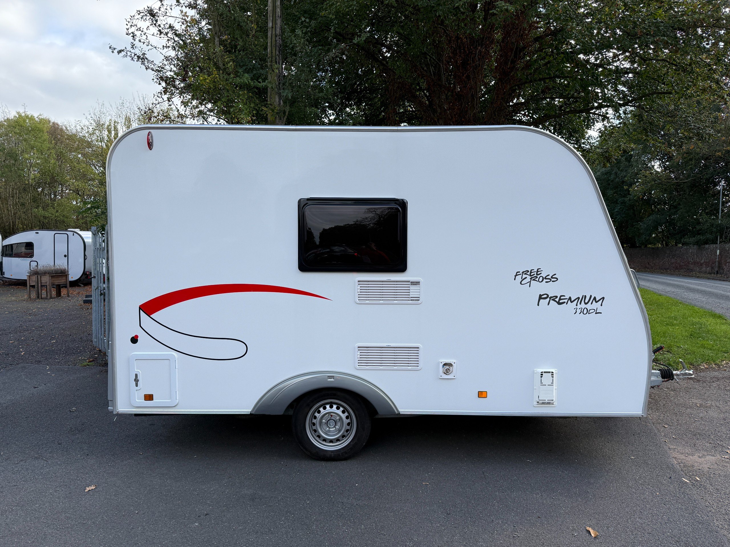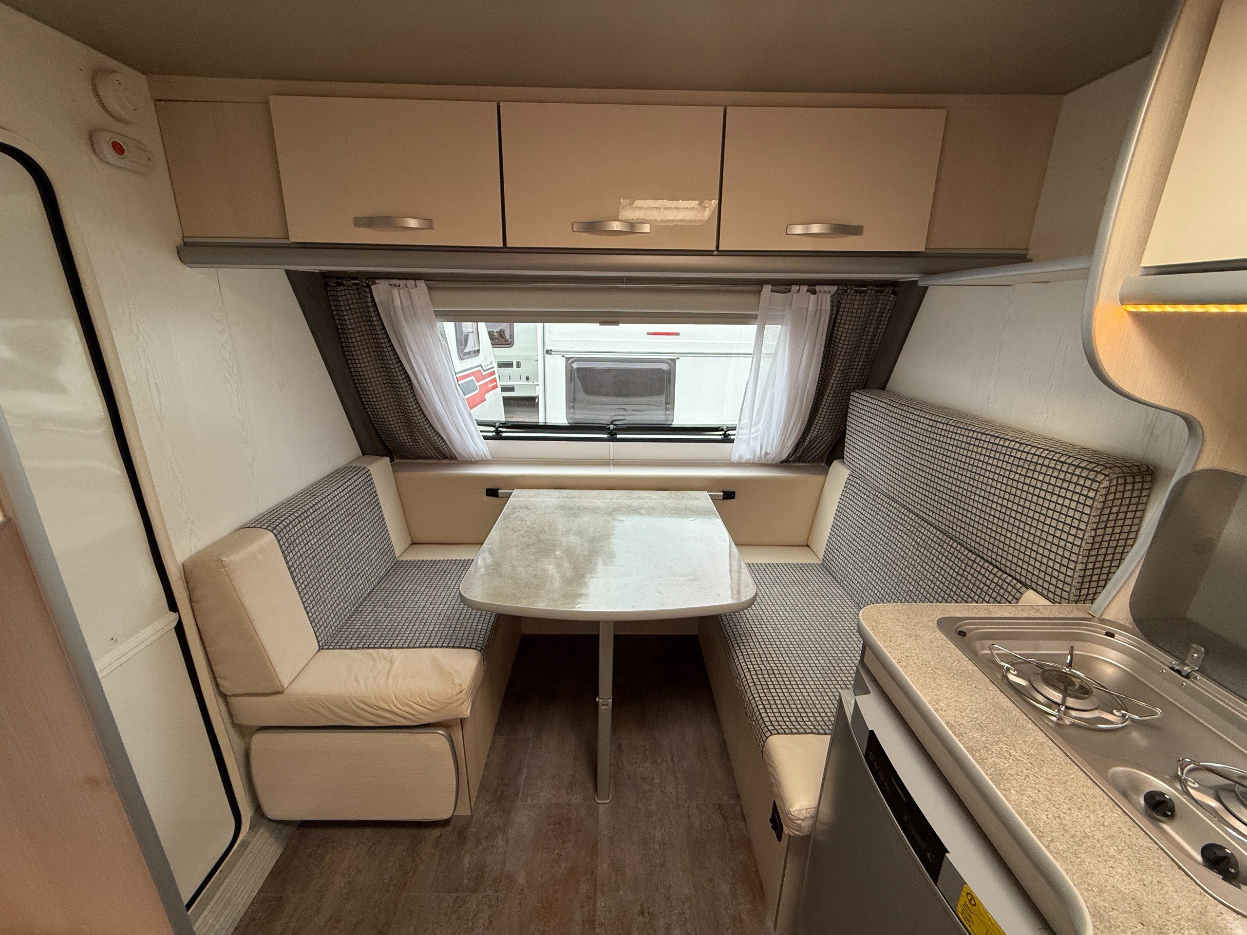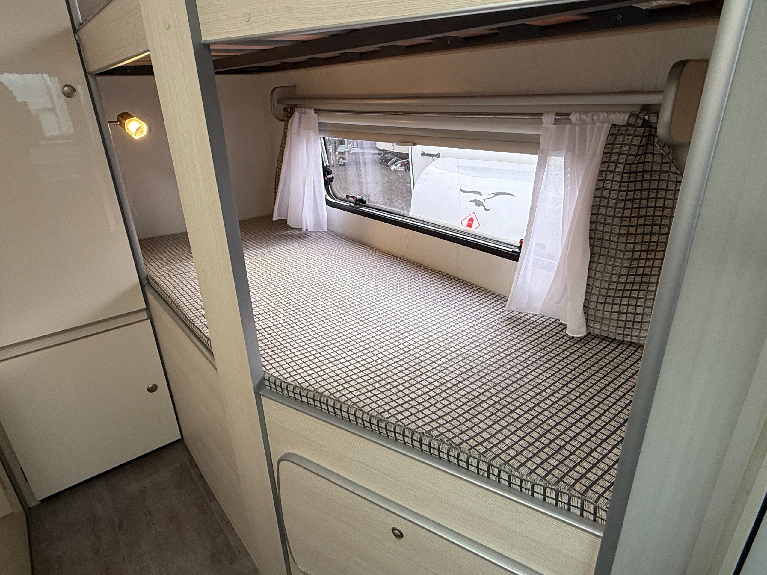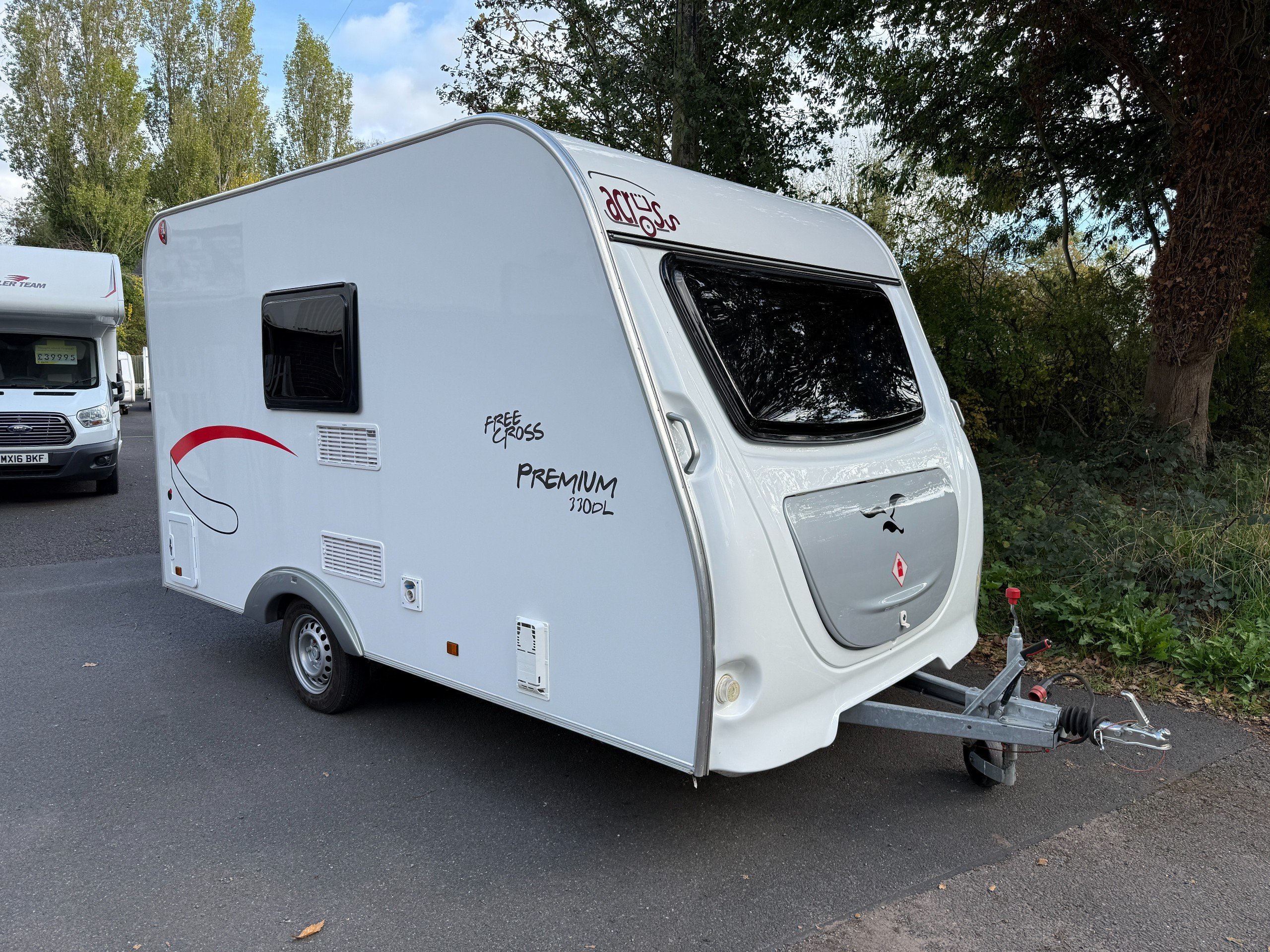 This FreeCross 330DL is a lightweight 4 berth family caravan with a double dinette conversion at the front and fixed bunk beds at the side.